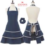 エプロン 日本製 撥水ブルー&ホワイトラインスイートティアードエプロン/シュシュ付STH03 フリル 大人 おしゃれ かわいい 紺 ネイビー