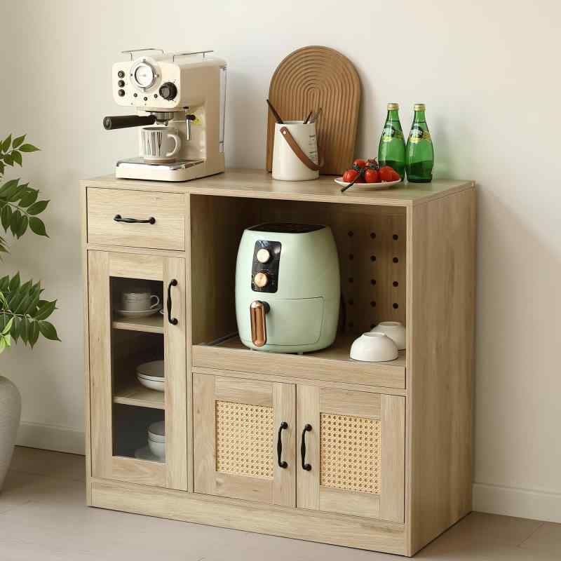 【レビュー投稿5%OFFクーポン配布中】レンジ台 幅88cm ラタン調 キッチンカウンター キッチンキャビネット 食器棚 キッチン収納 キャビネット コンセント付き スライド棚 ガラス扉 引き出し付き 大容量 省スペース 北欧 ナチュラル/ブラウン