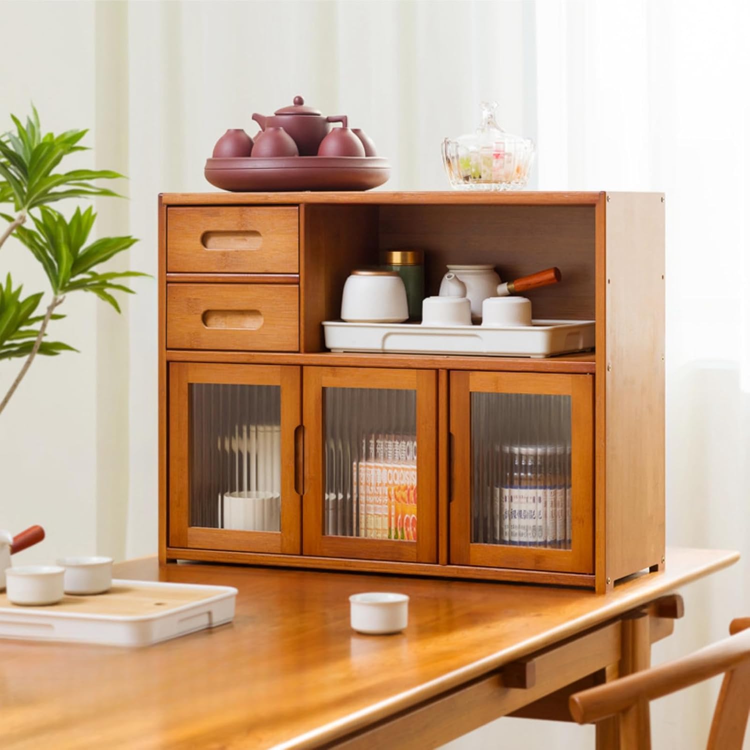 キッチンキャビネット キッチンカウンター 食器棚 コップ 収納 竹製 キッチン収納 キッチン 棚 組み立て式 2段 3段 防塵 調味料棚 食器収納 おしゃれ (茶色 C) CV-9723