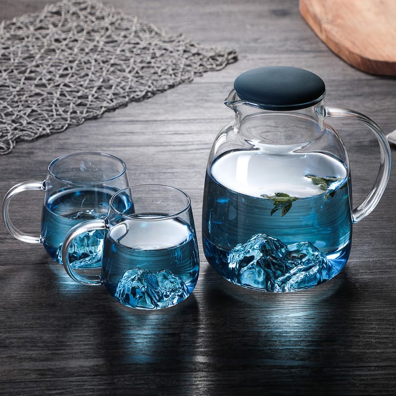 【PT10倍+10%OFFクーポン】【1800ml】【ティーポットセット】山グラス ガラスポット ティーボット ガラスカップ 1.8リットル 耐熱ガラス 直火対応 電気ケトル対応 ホウケイ酸ガラス 手作り おしゃれ ブルー 父の日