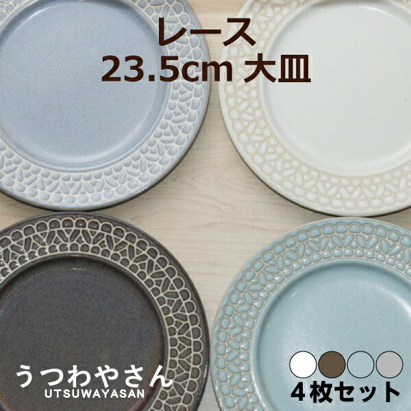 レース 大皿 4枚セット プレートL 食器セット ホワイト/ブラウン/ブルー/グレー 箱入 23.5cm パスタ皿 ケーキ皿 ディナープレート パン皿 9吋 丸皿 中皿 おしゃれ かわいい カフェ食器 カフェ風 インスタ映え レース模様 日本製 食器 美濃焼