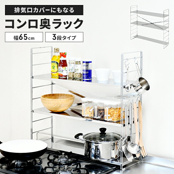 【楽天スーパーSALE10%OFF】【値下げ】コンロ奥ラック 3段 幅65cm ステンレス製 排気口カバー付き 日本製 60cmコンロ用 コンロ奥 ラック 棚 S字フック付きコンロ台 コンロ周り 隙間 一時置き 収納 調味料 多機能ラック 調味料ラック キッチンラック