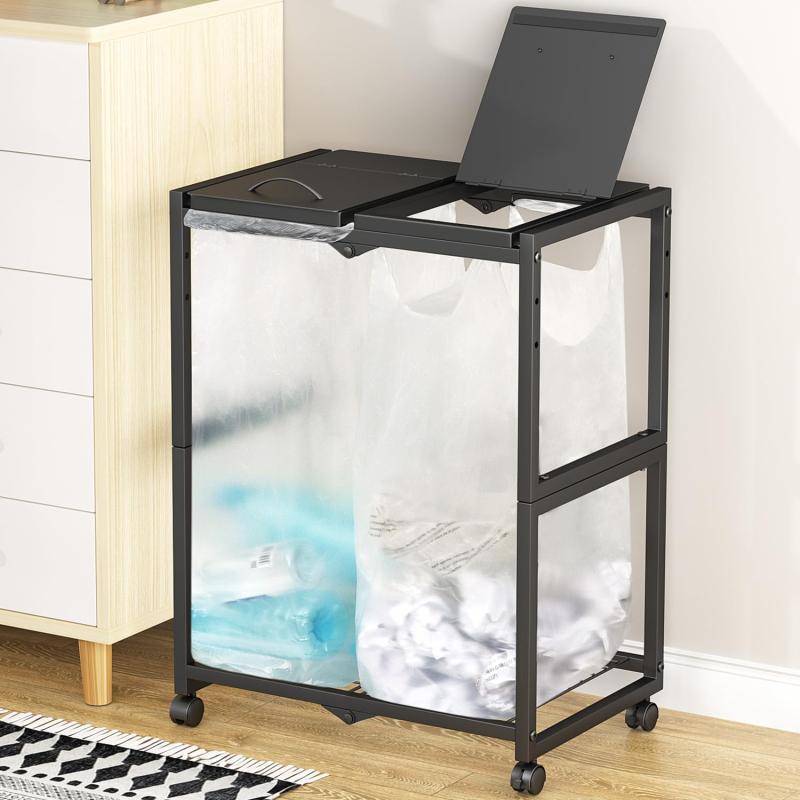 ゴミ袋ホルダー 3分別*30L ゴミ箱 ふた付き レジ袋を隠すゴミ袋スタンド 90L大容量 キャスター付きダストボックス 目隠しダストワゴン ステンレス製 おしゃれ 黒