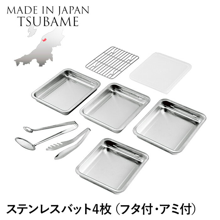 【楽天スーパーSALE10%OFF】バット ステンレス 角型 4枚 蓋付き アミ付き トング付 角バット 重ねて収納 仕込み 下ごしらえ 調理 調理器具 燕製品 日本製