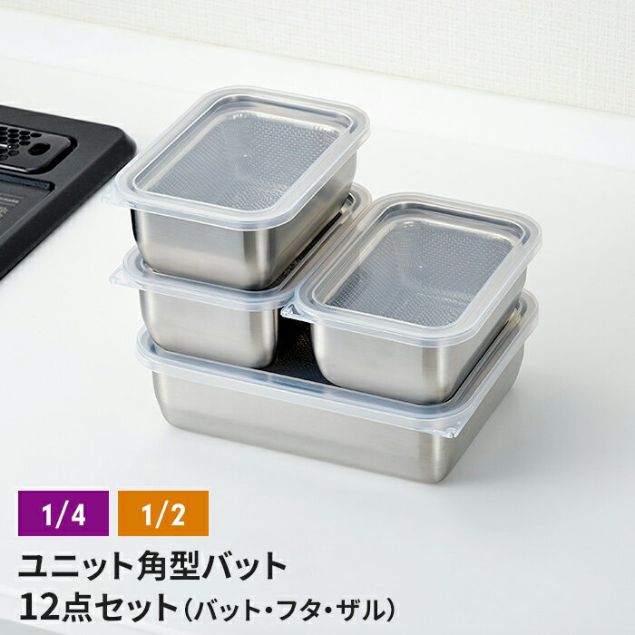 【楽天スーパーSALE10%OFF】ザル・バット3点×4個組セット バット/フタ/角ザル 燕三条 角型 キッチンバット 蓋付き バット ステンレスバット ステンレスザル ざる 水切りザル 日本製 ステンレス製 ザル 下ごしらえ 水切り 下処理 重ねて使える 新生活 一人