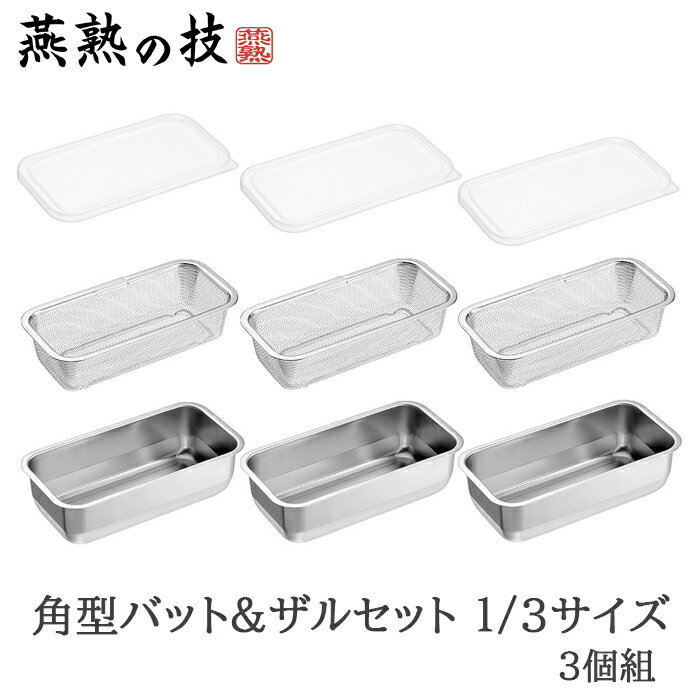 [10%OFF!楽天スーパーSALE 12/4 20:00〜12/11 1:59] バット ザル セット ステンレス 角型 蓋付き 水切り 脚付き 下ごしらえ 1/3サイズ 各3個 日本製 燕三条