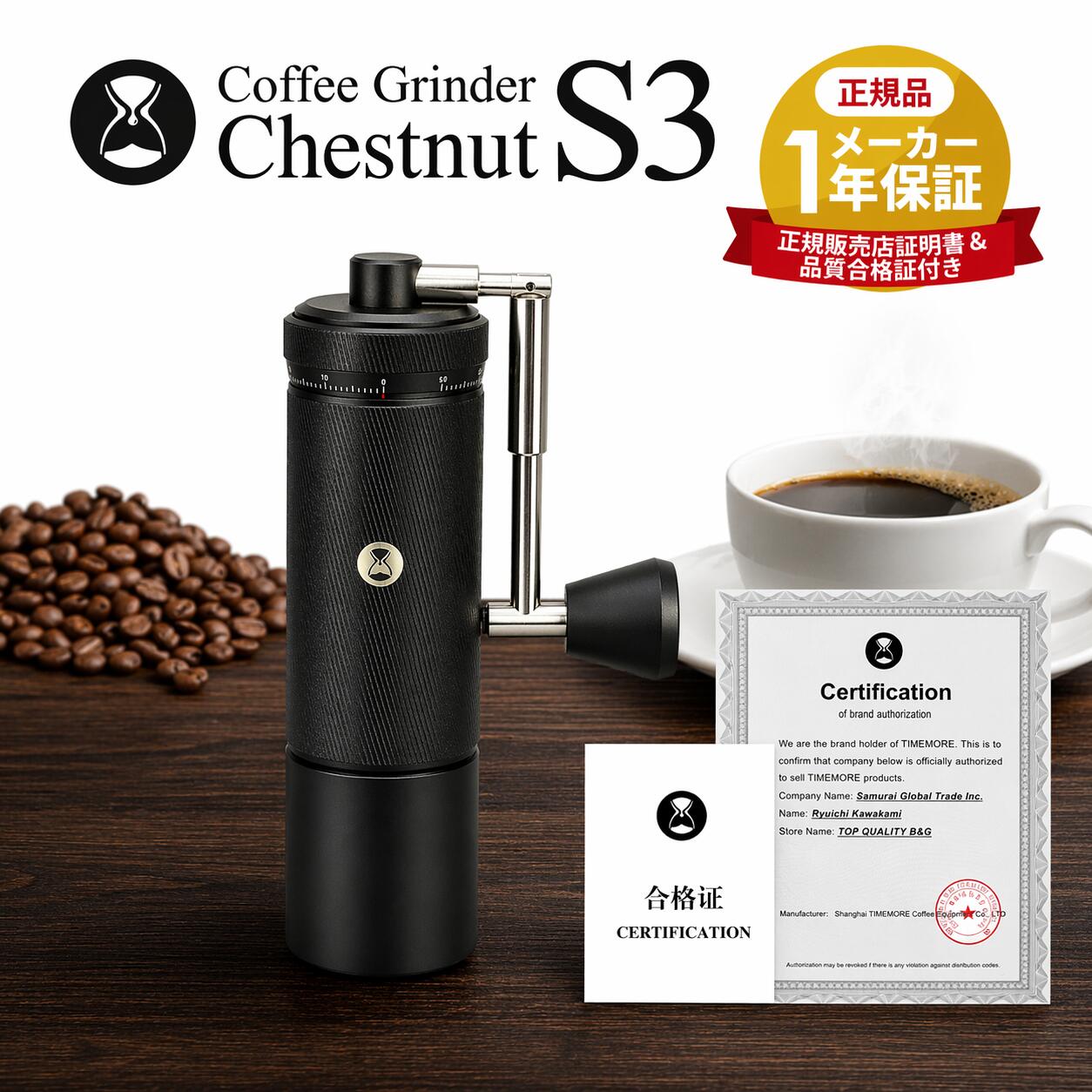 【安心の正規品/証明書付き】 TIMEMORE タイムモア S3 豆挽き 手挽き コーヒーミル 栗子 S2C890臼刃 粒度調節 手動グラインダー 短時間 ブラック 黒