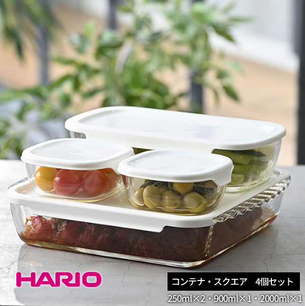 【スーパーSALE★最終在庫30%OFF】 耐熱ガラス製保存容器[スタッキング耐熱ガラスコンテナ・スクエア 4個セット HKOZ-5004-OW] ハリオ フタ付 スタッキング 電子レンジ・オーブン・食洗器OK[HARIO] 【最短発送】【e暮らしR】【ポイント2倍】[PNG02]