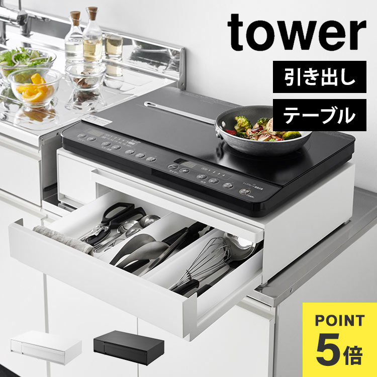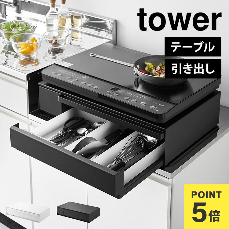 山崎実業 キッチン 引き出し カトラリー 収納 tower タワー IHクッキングヒーターラック 引き出し&スライテーブル 白 黒 カウンター上 ラック スライド 電子レンジ下 オーブン レンジ台 家電下 作業台 調理台 IHコンロ台 スペース 有効活用 一時置き 1293 1294