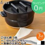 かもしか道具店 ごはんの鍋 3合+陶の飯びつ ふつう+ごはんのしゃもじ[ご飯鍋 飯びつ おひつ しゃもじ セット 土鍋ご飯 3合 土鍋ごはん ガス お米 ごはん 食卓 陶 ごはんの保存 保存容器 1.5合 黒 白 茶 ふんわり 盛る ひとり暮らし 木製] 即納
