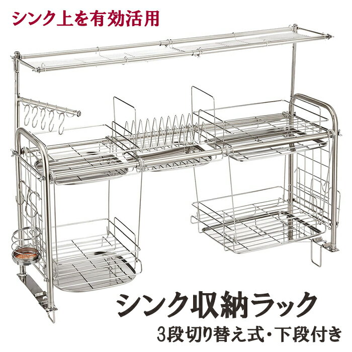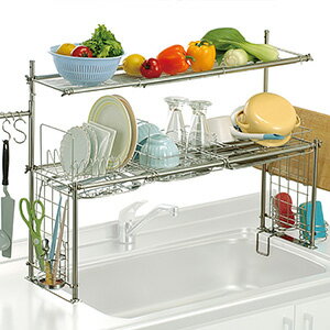 [☆7%offクーポン発行中☆-12/04まで] シンク上収納 水切りラック 伸縮 ステンレス 下段付き シンク収納 箸立て まな板立て S字フック付き