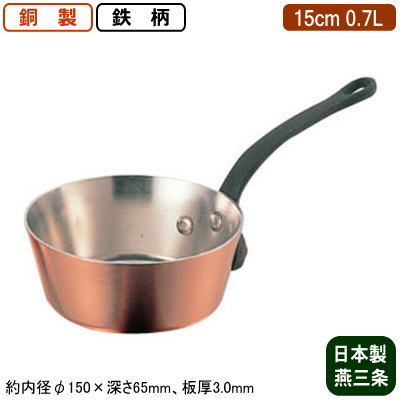 【銅製 テーパー鍋 日本製 板厚 3mm 送料無料】銅製 極厚 テーパー鍋 (鉄柄) 15cm 0.7L【新潟県/燕三条/業務用/家庭用/銅製/銅製品/銅製鍋/鍋/銅鍋/片手鍋/業務用鍋/熱伝導性/省エネ/まろやか/銅イオン/抗菌作用/衛生的/プロ仕様/調理用品/厨房用品/厨房道具】