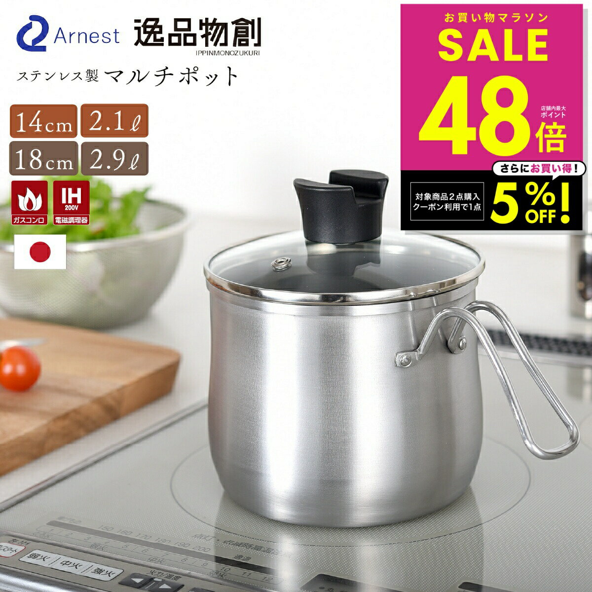 【2点購入で1商品5%OFFクーポン! 2/4 20:00〜】マルチポット ステンレス 鍋 14cm 18cm 逸品物創 燕三条 日本製 片手鍋 調理鍋 鍋 一人暮らし 一人鍋 小さめ IH対応 お手入れ簡単 1台8役 コンパクト スリム ガラスふた付 揚げ物 保存 作り置き アーネスト p10