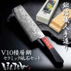 名入れ無料 包丁と砥石のセット重宏別作 菜切り包丁 V金10号 ダマスカス模様京東山 CRセラ 中砥石 #1000台付