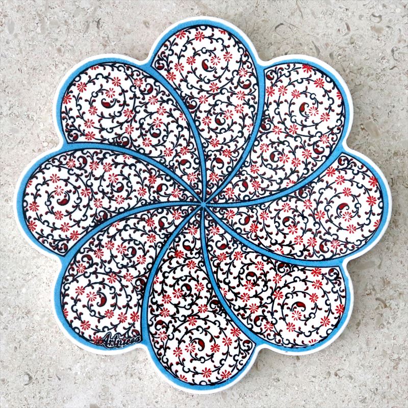 【10%OFFクーポン対象】トルコ陶器の鍋敷き・ブルーリーフ・レッドフラワー