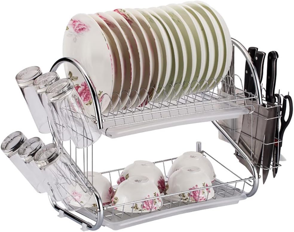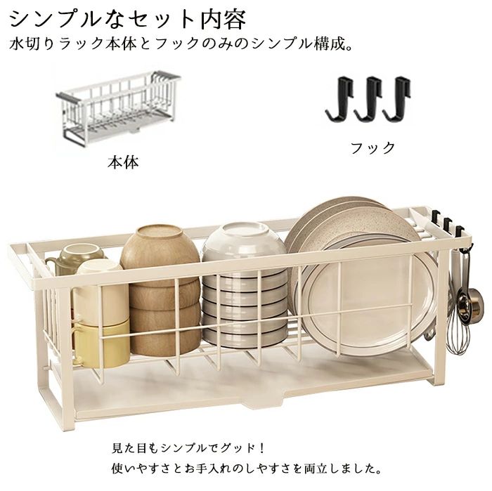 食器 水切りかご 2段式水切りラック バスケット ステンレス製 錆びない 水が自動で流れる 乾燥 食器水切り ディッシュラック 大皿立て 鍋蓋スタンド 箸立て まな板立て トレー付 シンク 調理台 日本語取付け説明書付き (ホワイト)