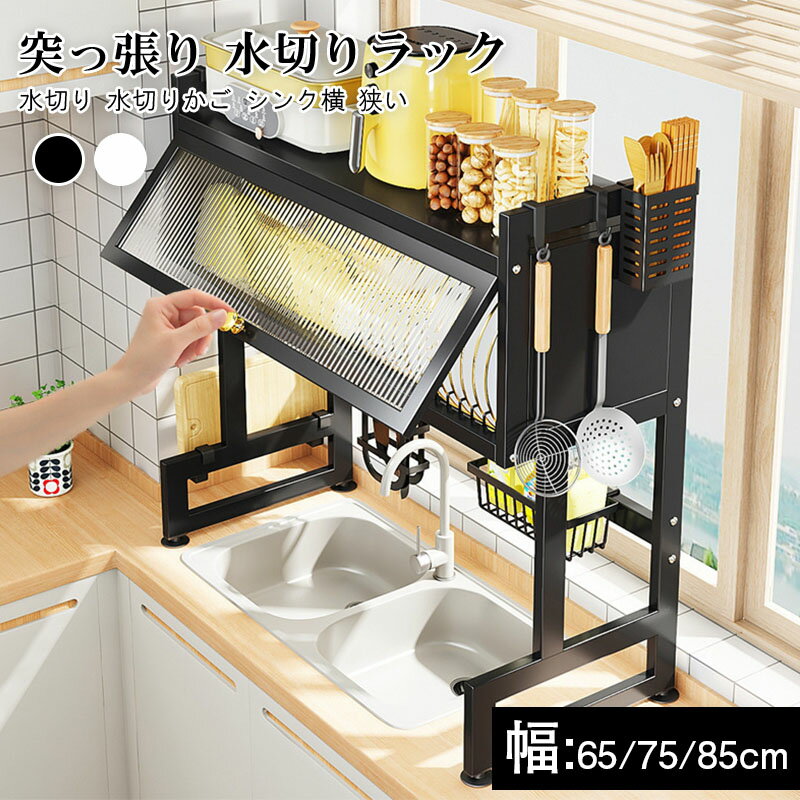 突っ張り 水切りラック 流れる バスケット 2段 棚 1枚 ステンレス ホワイト ブラック 幅65-85cm 奥行29.5cm 高79cm 箸立て コップかけ まな板立て 包丁 自動水切りトレー