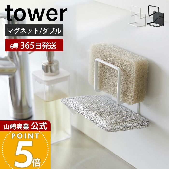 【365日出荷】山崎実業 マグネットスポンジホルダー ダブル タワー tower 公式 おしゃれ 磁石 スポンジラック スポンジ置き 使い分け 食器洗い用 掃除用 スポンジ 2段 水切り ホワイト ブラック 3280 3281