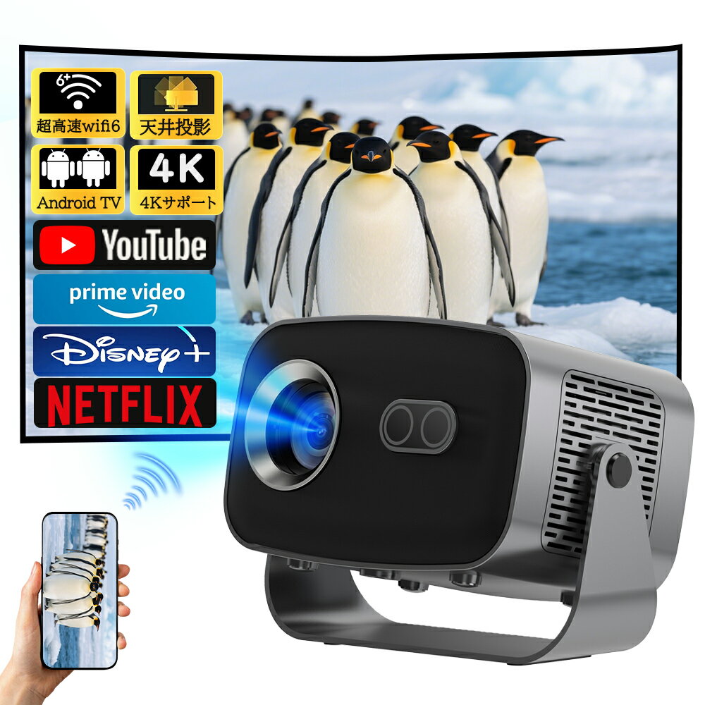 1000円OFFクーポン【2025最新Android TV搭載】プロジェクター 天井 プロジェクター 小型 家庭用 15000LM 4K対応 1080P 自動台形補正 Wi-Fi6 Bluetooth5.3 スタンド一体型 Hi-Fi スピーカー 短距離投影 iOS/Android/パソコン/DVD/PS機対応 日本語説明書 3年保証