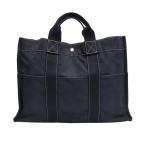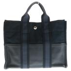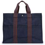 (中古)HERMES エルメス フールトゥ GM トート コットン100% ネイビー ブラウン ハンドバッグ シルバー金具