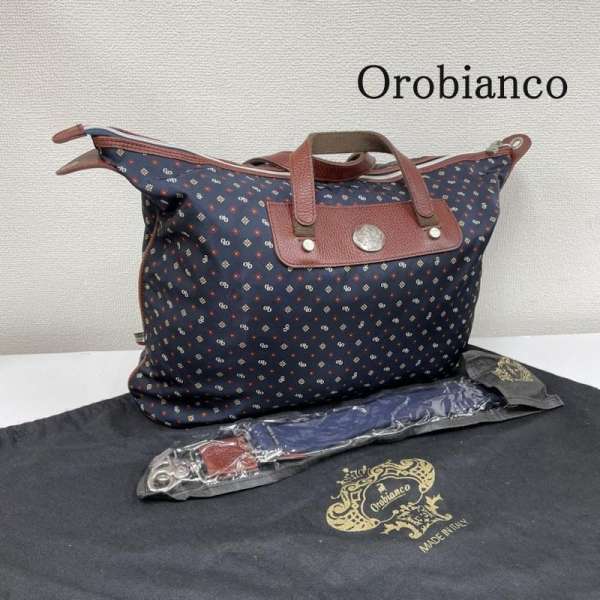 オロビアンコ 2WAYハンドバッグ ネイビー ベージュ ナイロン レザー 中古 斜め掛け ショルダーバッグ ストライプ メンズ 男性 Orobianco