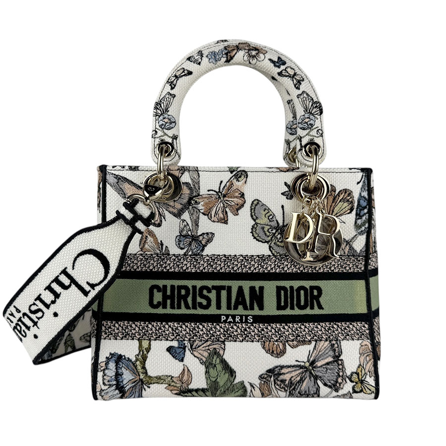 【中古】新品同様 未使用品 Christian Dior クリスチャンディオール レディディオール 蝶 ピンク ホワイト 刺繡 2Way ハンドバッグ ショルダーバッグ ゴールド金具