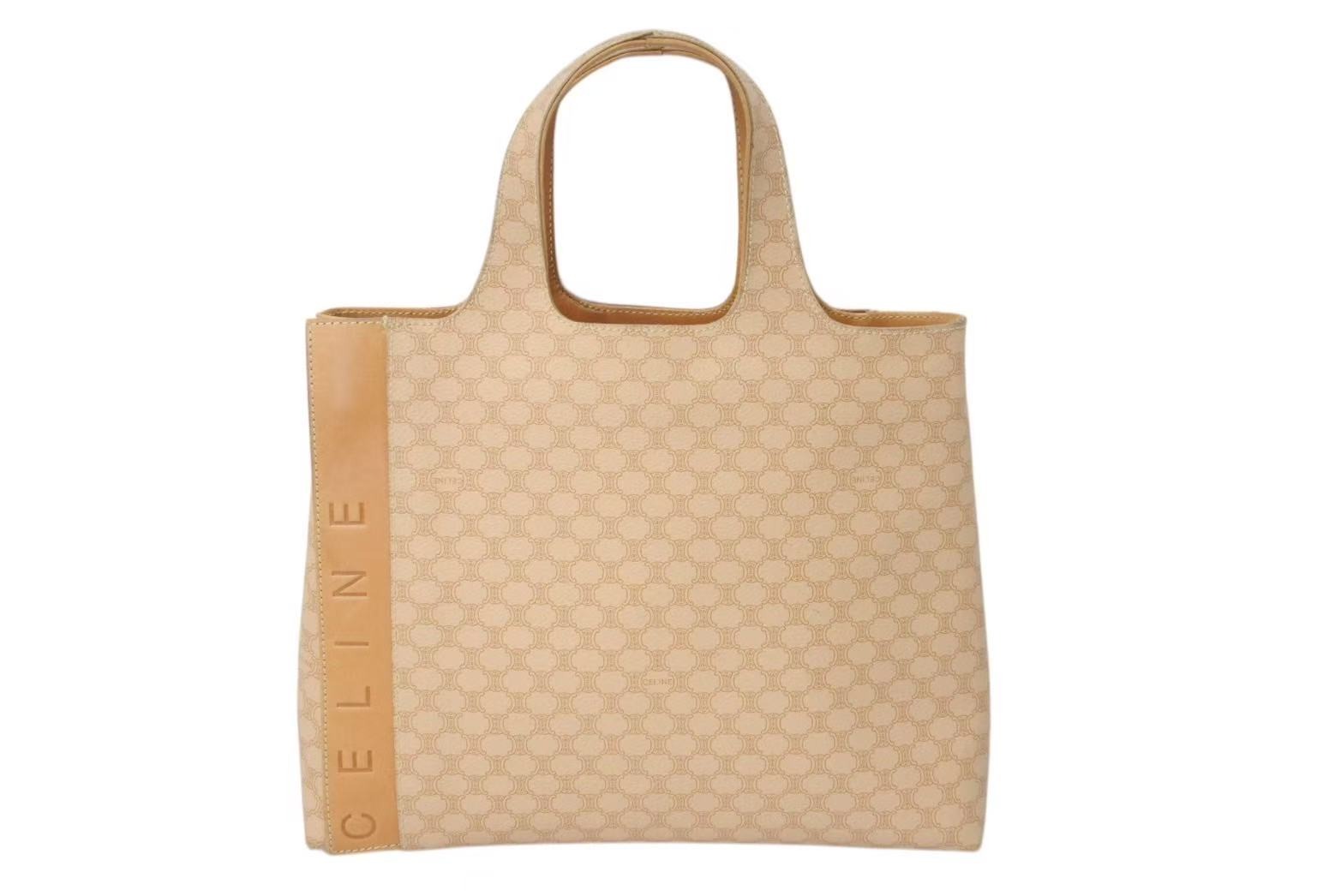 CELINE セリーヌ マカダム ロゴ ヴィンテージ ハンドバッグ ベージュ ロゴ PVC レザー 鞄 ゴールド金具 ブランド レディース バッグ 良品 中古 4c073669