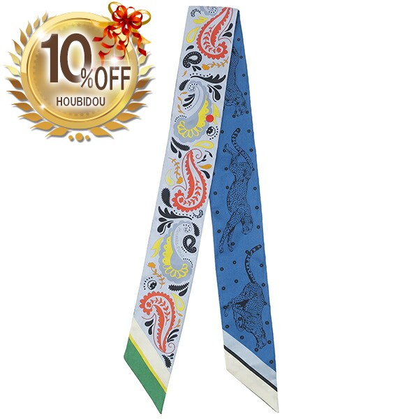 \10%OFFセール/ エルメス HERMES スカーフ ツイリー シルク ブルーシエル×ジョーヌヴィフ×レッド 【GUEPARDS BANDANA MULT/チーター バンダナ】 【箱】【中古】