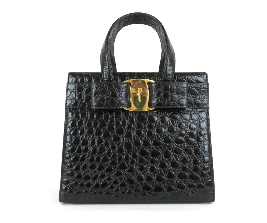 Salvatore Ferragamo サルヴァトーレ フェラガモ ガンチーニ ハンドバッグ BR212638 クロコ型押し レザー ブラック ゴールド金具 2WAY ショルダーバッグ【本物保証】【中古】