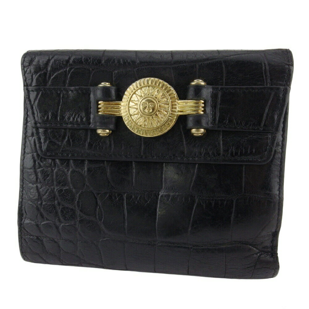 【Fashion Special Fair 30%OFFクーポン】ジャンニ・ヴェルサーチ Gianni Versace 二つ折り財布 サンバースト ヴェルサーチ クロコ調 ブラック ゴールド メンズ 中古 ブランド ハイブランド ヴィンテージ