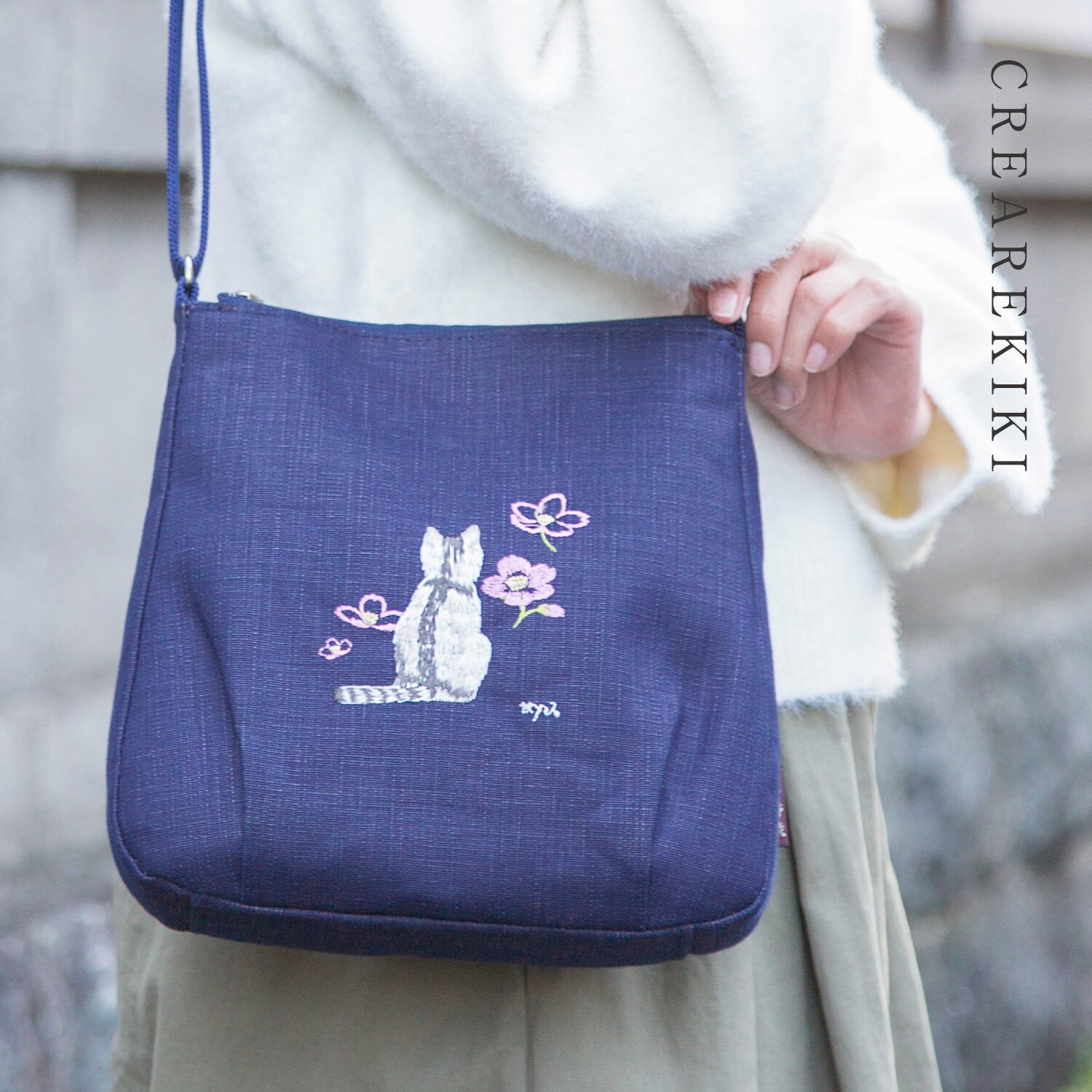 ショルダーバッグ レディース 斜めがけ 軽い 柿渋染め 和装バッグ カジュアル ポシェット 日本製 藍 柿渋染 ねこ柄 刺繍 クレープ 旅行 サブバッグ 母 誕生日 女性 退職祝い 還暦祝い 古稀 喜寿 お祝い 60代 70代 80代 ギフト [くれあーれきき] IZ-20Sn