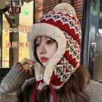 ニット帽 ニットキャップ 帽子 エスニック 耳あて付き 厚手 ボア 毛玉 ボンボン ふわふわ もこもこ レディース 学生 寒さ対策 小顔効果