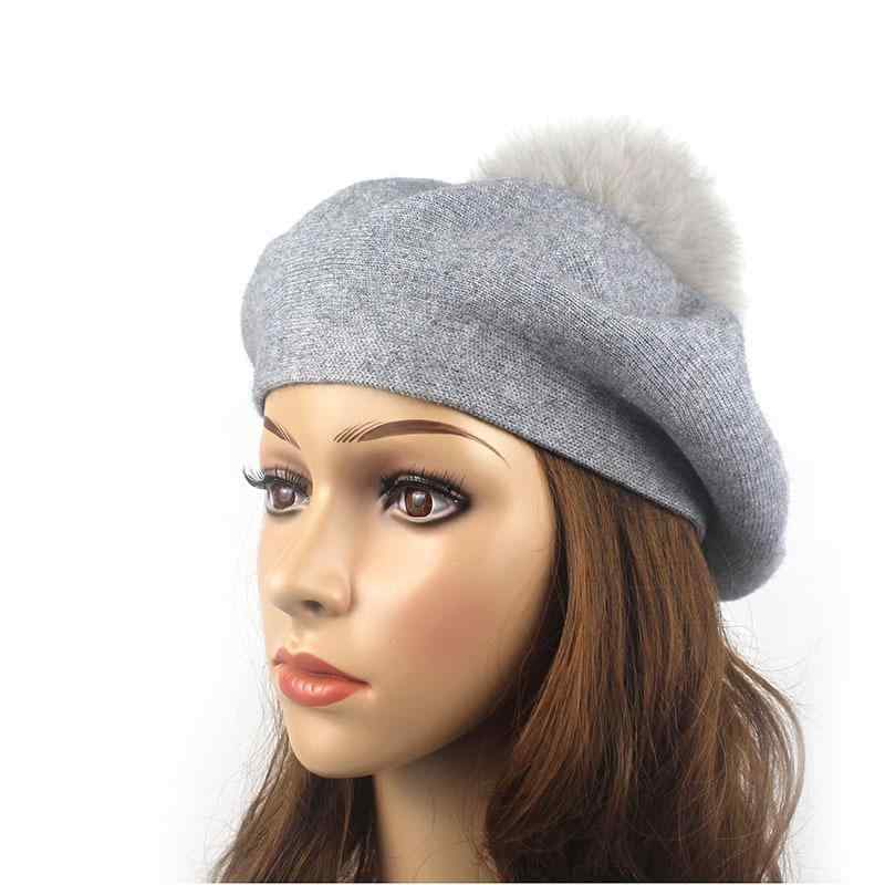 ベレー帽 レディース 秋冬 ウール 帽子 ファッション フォックスファー ぽんぽん付き ニット帽 画家帽 イエロー ブラック ピンク オレンジ グレー ベージュ2