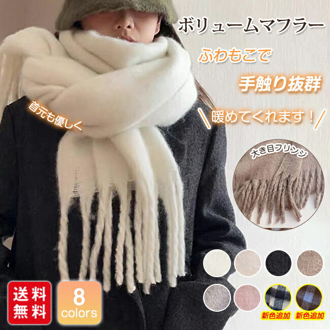【5%OFFクーポン配布中!】【新色追加】マフラー レディース ストール ショール ふわふわ 起毛 ボリューム 230*35cm 大判 全8色 チェック柄追加 太フリンジ 無地 ロング丈 秋冬
