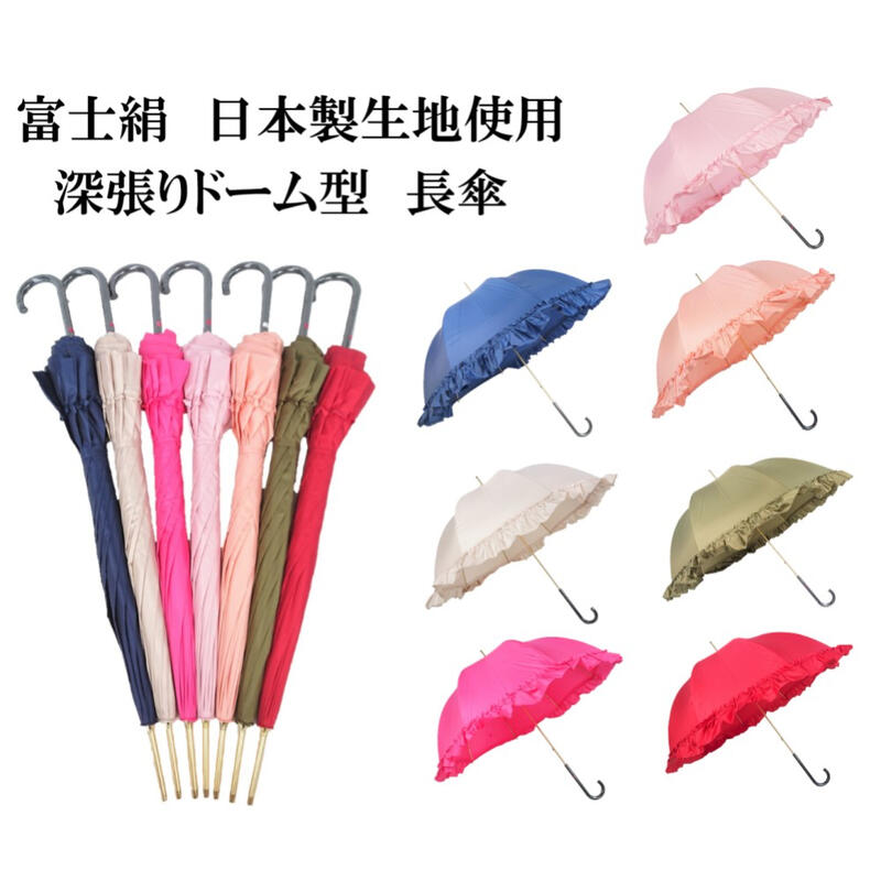 【レディース雨傘/長傘】婦人長傘 日本製生地 富士絹 深張り&フリル 手開き長傘 高級感のある日本製の富士絹生地を使用 大きなフリルとドーム型のエレガントなデザインです 傘/婦人/レディース/雨/贈り物/おしゃれ/ギフト/妻/プレゼント/かさ/カサ/シンプル/無地/フリル/