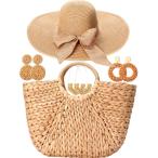 Loetere 5個 レディース ラージ ストロー ビーチ トートバッグ 5.5インチ 大きな蝶結び 麦わら帽子 ラタンイヤリングセット 夏 手織り