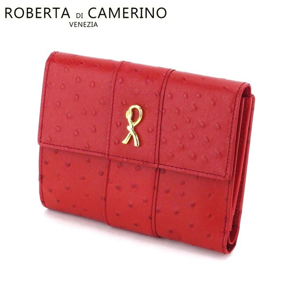【Fashion Special Fair 30%OFFクーポン】ロベルタ・ディ・カメリーノ Roberta di Camerino 二つ折り財布 オーストリッチ調 Rマーク レッド ゴールド レディース 中古 ブランド ハイブランド ヴィンテージ