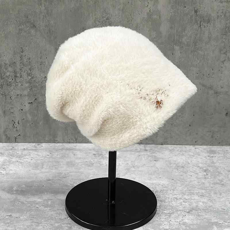 ニット帽 レディース 秋冬 防寒 保温 小顔効果 ビーニー 水钻 ラインストーン フェイクファー 二重構造 厚手 イヤーマフ付き かわいい ガーリー カジュアル ベージュ ホワイト モカ ピンク グレー オレンジ2