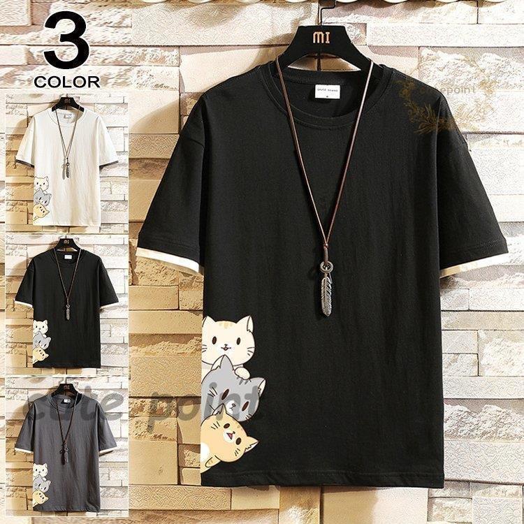 【期間限定10%OFF】半袖Tシャツ メンズ おしゃれ Tシャツ 切り替え 猫柄 五分袖Tシャツ 大きいサイズ 夏 通学 通勤 可愛い