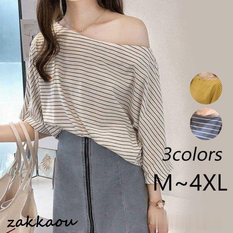 Tシャツカットソーレディース春夏半袖Tシャツ肩出しオシャレTシャツブラウスボーダーオシャレトップスゆったりカジュアル大人30代40代50代