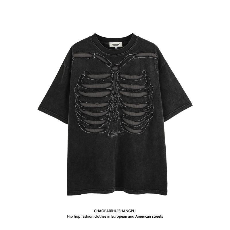 メンズ レディース 古着風 おしゃれTシャツ アメリカン スケルトン 骸骨 レトロ 半袖 Tシャツ アメリカ ストリート ヒップホップ ウォッシュド加工 オールド センス コットンウール生地