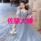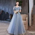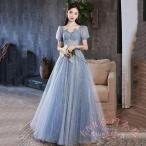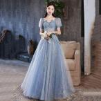 イブニングドレス ロングドレス ブルー 結婚式ドレス 二次会ドレス ワイン赤 パフスリーブ Vネック 発表会ドレス スパンコール キラキラドレス 演奏会ドレス ピ