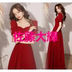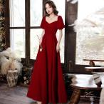 イブニングドレス ワイン赤 結婚式ドレス 二次会ドレス ロングドレス ワインレッド ゲストドレス パフスリーブ Vネック 発表会ドレス Aライン ロング丈 パーティ