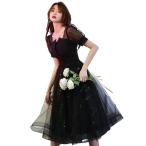 パーティードレス 結婚式 ワンピース レディース 黒 ベージュ キラキラ 半袖 スパンコール シアー ミモレ丈 透け感 Aライン ワンピ