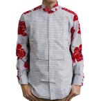 長袖綿100%ボザムシャツ ウィングカラー 比翼前立 ナポリカフス グレーギンガム バラプリント【爆買】