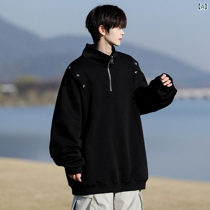 メンズ パーカー アメリカン アメリカン スタイルの ハイ カラー ハーフ ジップ スウェットシャツ、 メンズ バイブ、 ハイ ストリート、 ヘビースウェット ジャケット、 スプリング、 エクストラ ラージサイズ、 ロングスリーブ T シャツ