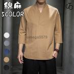 メンズ シャツ プルオーバー 七分袖 Tシャツ 綿麻風 半袖カットソー 夏服 カジュアル 甚平風 ゆったり 部屋着 ルームウェア リラックス