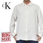 大きいサイズ メンズ CK Calvin Klein カルバンクライン 長袖シャツ ワンポイント刺繍 リネン 麻 ストライプ柄 XXL