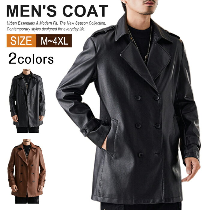 \6%OFFクーポン 30日まで/トレンチコート メンズ レザーコート レザージャケット ダブルジャケット PUレザー フェイクレザー ハーフコート ビジネス アウター ブルゾン 防風 防寒 秋冬 フォーマル 通勤 紳士服 父の日 プレゼント大きいサイズ ブラック ブラウン