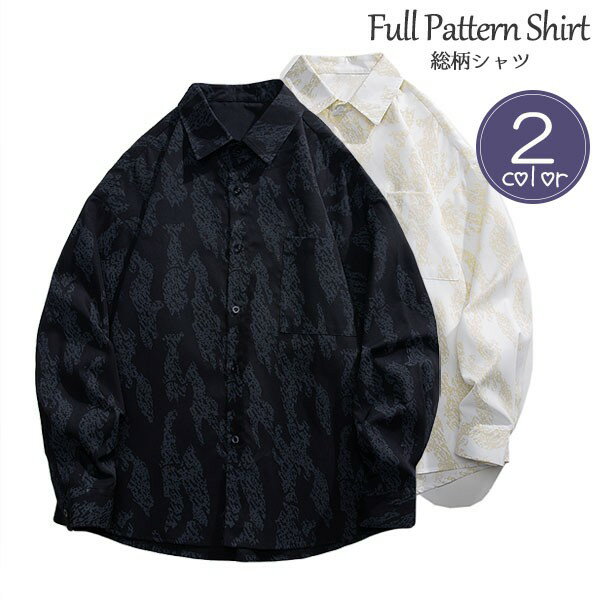 総柄シャツ 折り襟 前ボタン 春 新品 メンズ 男女兼用 ユニセックス 定番 ポケット付き ボタンダウン型 欧米風 ウエスタン モード系 ストリート系 長袖 カジュアル レギュラー ブラック ホワイト 大きいサイズ dk057x1x1ze
